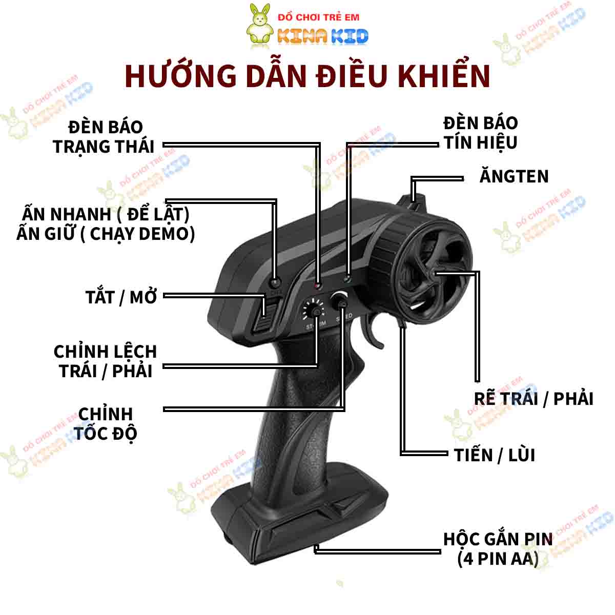 - Điều khiển từ xa bằng sóng 2.4G, hỗ trợ chơi nhiều phương tiên chơi cùng lúc.